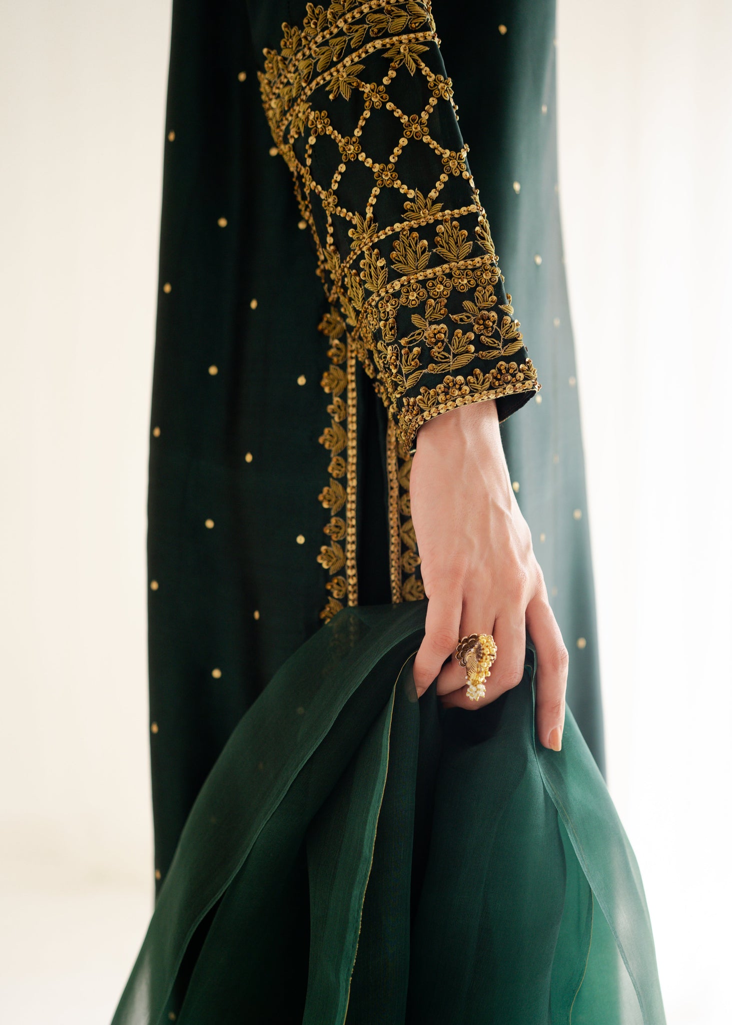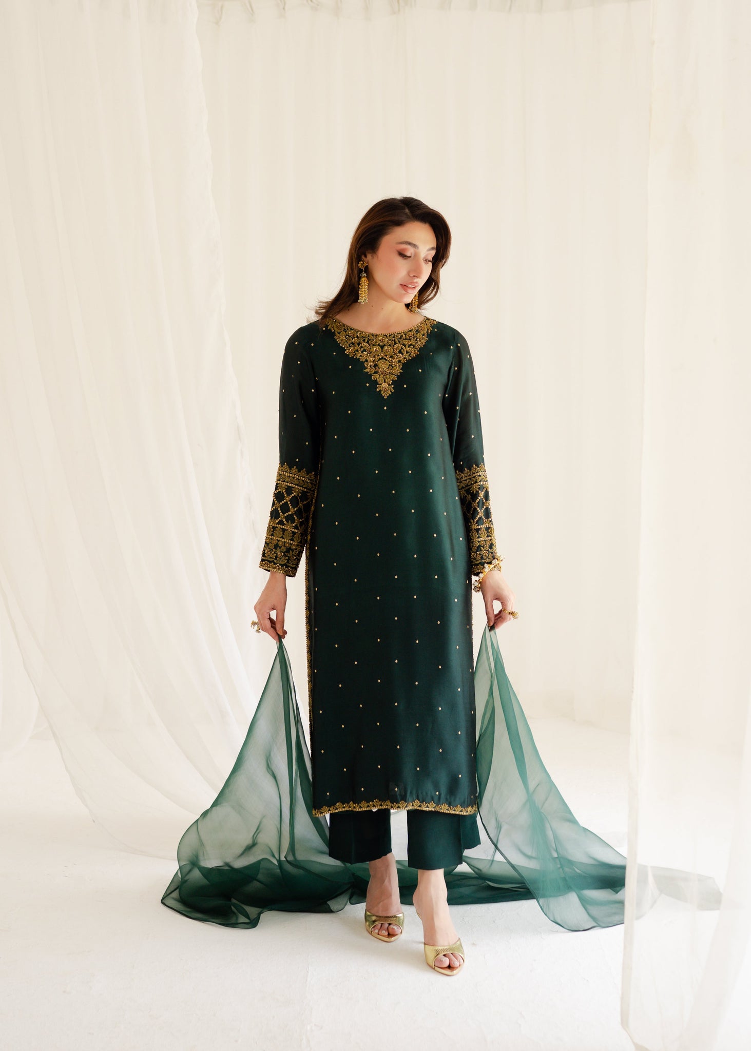 An elegant emerald ensemble crafted from pure sheesha silk, adorned with hand-embroidered dull gold zari and dabka detailing on the neckline, sleeves, and hem. Paired with raw silk trousers and a soft, airy organza dupatta for a graceful finish. Aarzu perfectly blends timeless craftsmanship with understated elegance — a minimal yet captivating choice for wedding guests who appreciate simplicity with a touch of luxury.