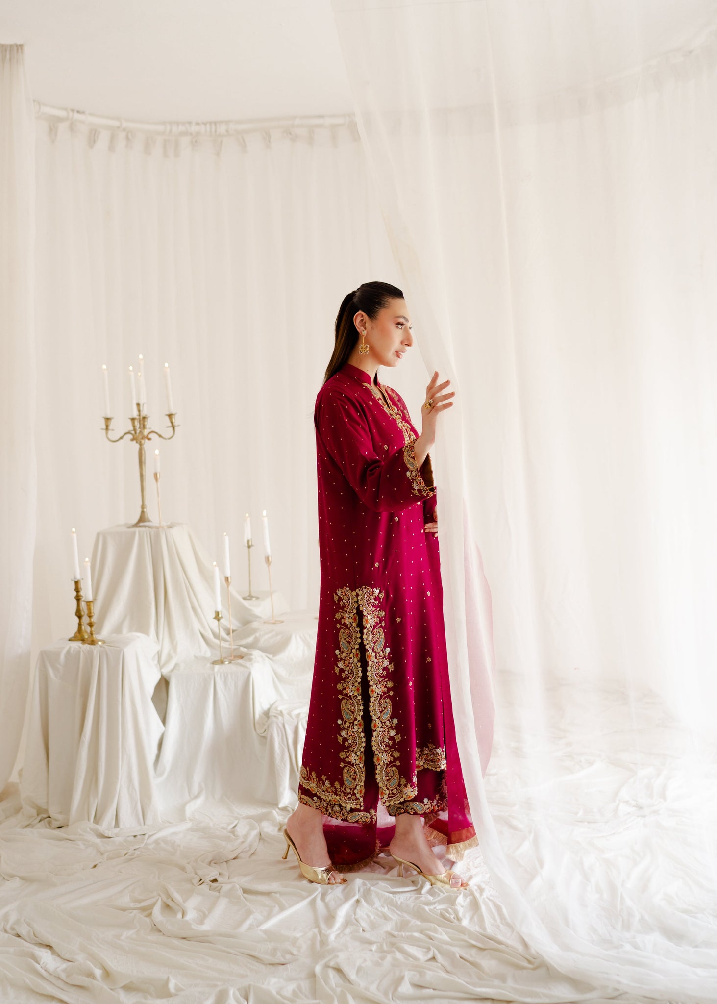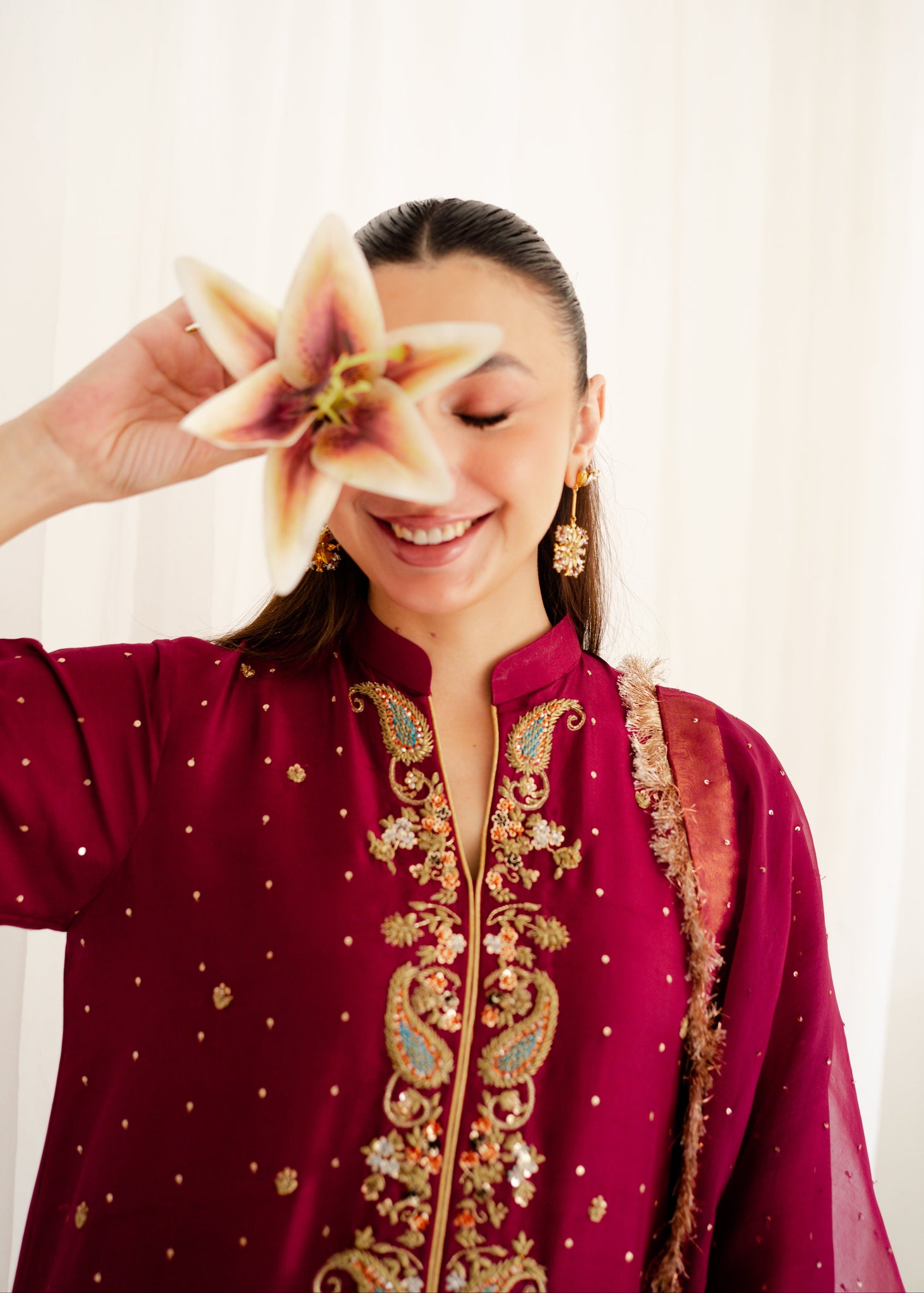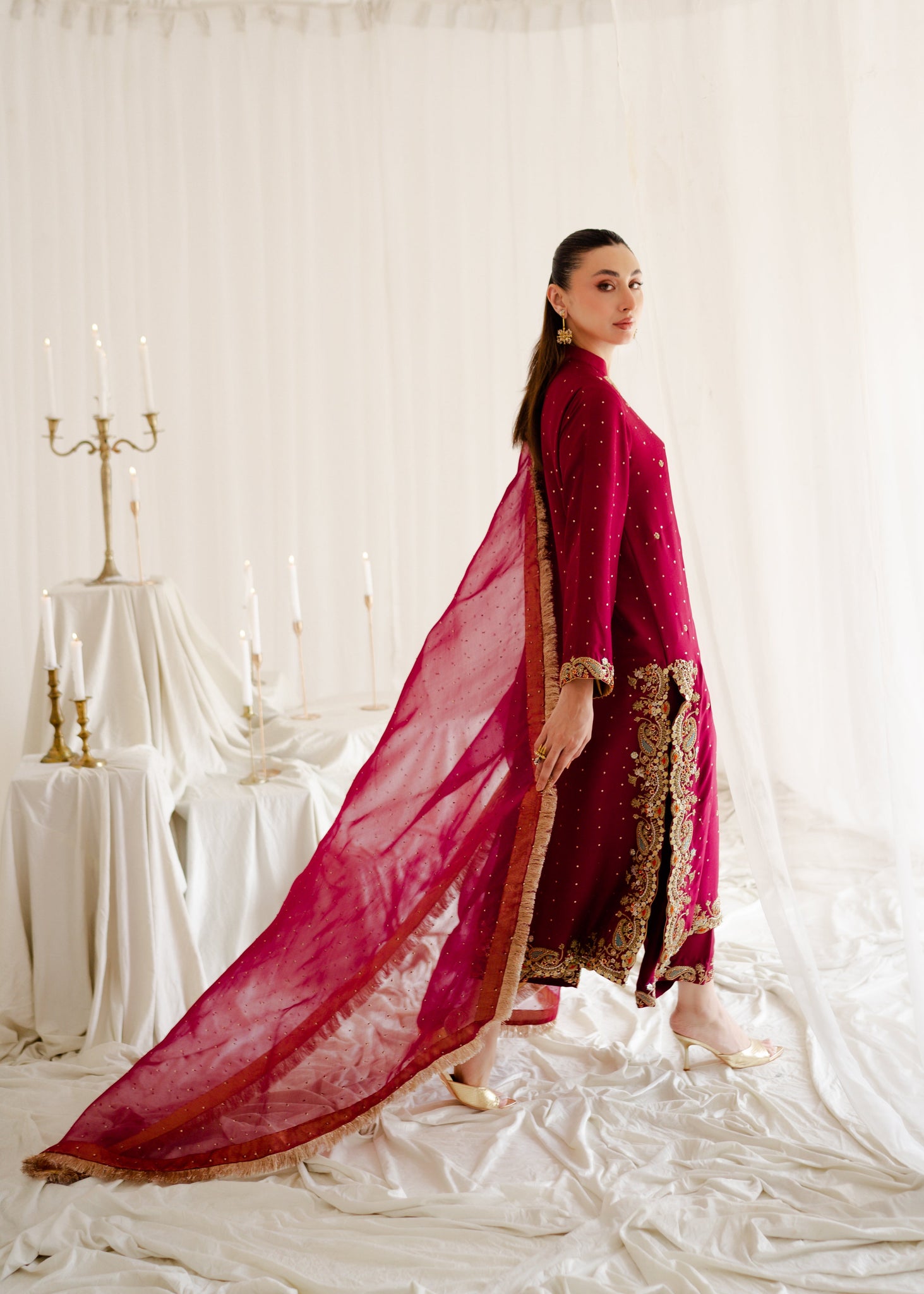 A timeless pomegranate red outfit crafted from pure 80g raw silk, adorned with exquisite handwork in zarri, gota, and colorful resham threads. The pure organza dupatta, detailed with kiran lace and sprinkled with hand-done sequins, adds a soft festive glow. Altish is a statement of tradition and allure, made for the ones who shine effortlessly at every Mehfil.