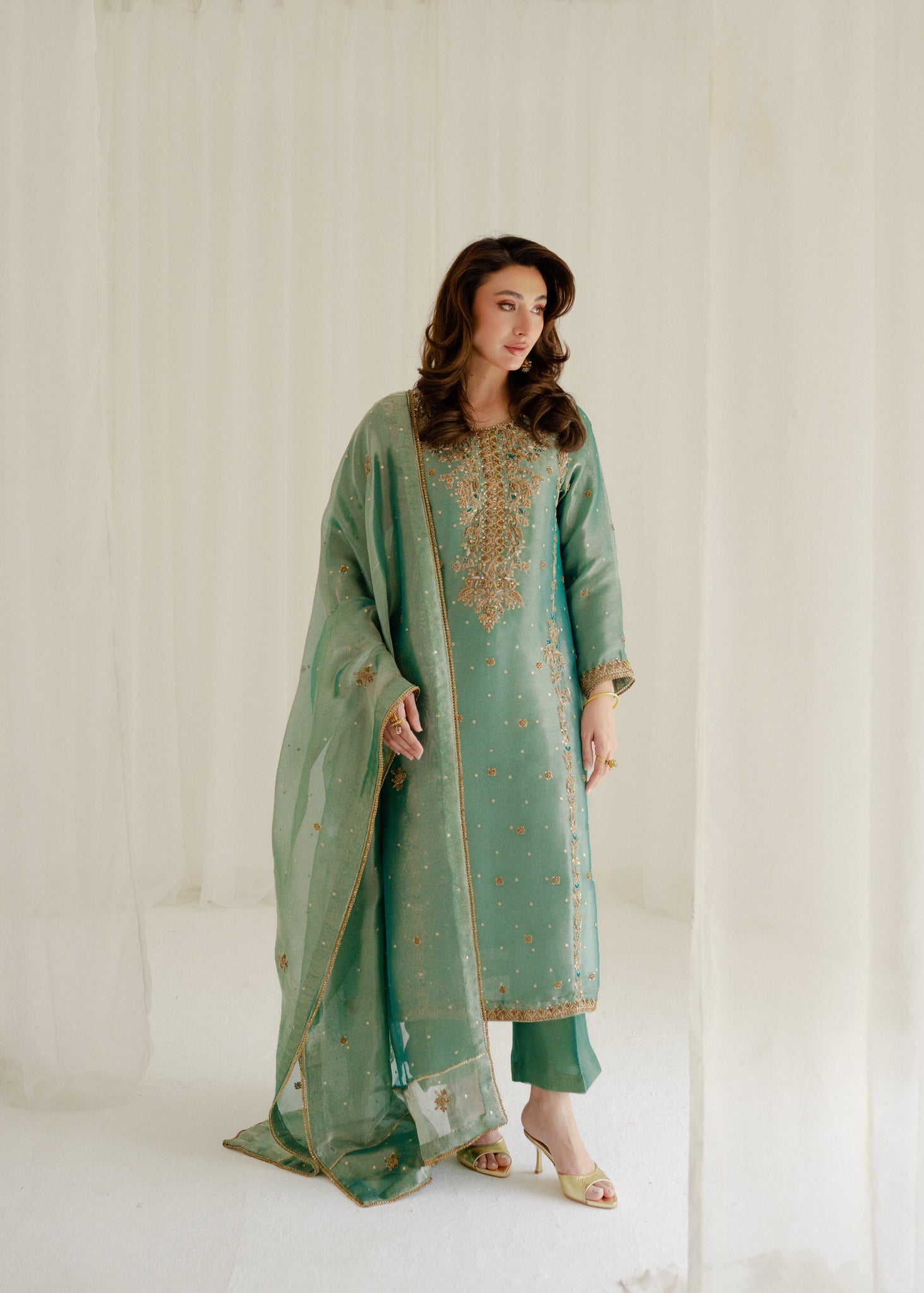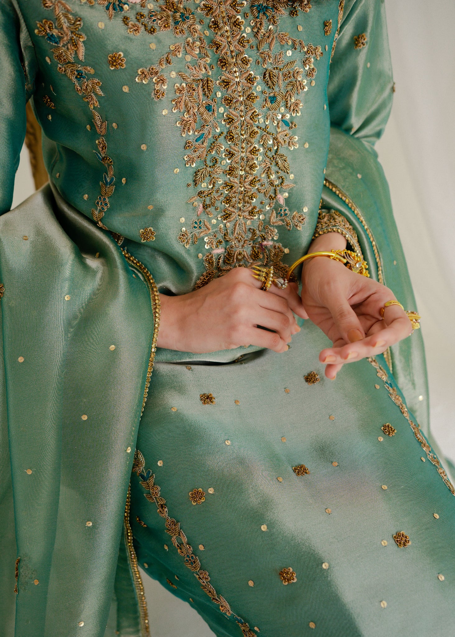 Reha embodies elegance wrapped in serene teal tones. This three-piece ensemble is tailored from pure tissue fabric with a fully lined shirt and trousers, ensuring structure and comfort. The hand embroidery in dull gold is beautifully balanced with subtle hints of baby pink and zinc silk threads along the neckline, hem, and panels. Paired with a matching tissue dupatta, bordered with jamawar facing for a touch of classic sophistication. Reha is a perfect pick for wedding guests who favour understated luxury and soft radiance.