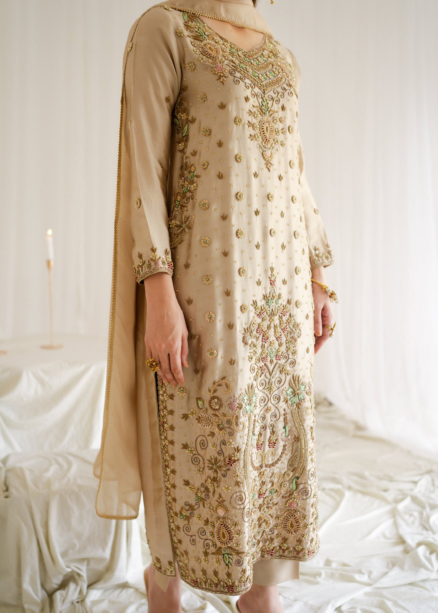 Draped in gold beige sheesha silk, Zareen embodies quiet luxury. Hand-embroidered with dabka, sequins, and touches of resham in green and red, it reflects classic craftsmanship with modern grace. Paired with raw silk trousers and a soft, sequined dupatta, this long, slim-sleeved silhouette radiates timeless sophistication, effortlessly regal, endlessly refined.